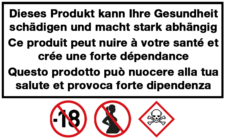 | Nicotine | 10 mg/ml – sel de nicotine, 12 mg/ml, 16 mg/ml – sel de nicotine, 20 mg/ml – sel de nicotine |