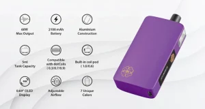 Avec jusqu’à 60W de puissance, ce pod s’adapte à tous les styles de vape : tirage aérien et nuageux ou vape plus serrée, plus discrète. Un petit écran OLED 0.69” affiche toutes les infos utiles : puissance, batterie, valeur de la résistance et compteur de puff.